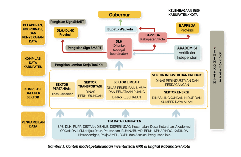 Secara sederhana, Inventarisasi Gas Rumah Kaca (IGRK) di Indonesia berjalan layaknya sebuah rantai informasi yang panjang. Di tingkat paling dasar, kabupaten dan kota mengumpulkan data dari berbagai sektor: berapa banyak bahan bakar yang digunakan untuk transportasi, berapa luas sawah yang ditanami padi, berapa jumlah ternak, hingga berapa ton sampah masuk ke tempat pembuangan akhir. Data inilah yang kemudian dihimpun oleh pemerintah provinsi.